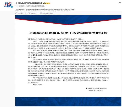 1月29日上午,国家体育总局、公安部、中国足协联合召开新闻发布会,介绍足球行业“假赌黑”问题专项整治行动的相关情况,13家俱乐部被罚。其中,上海申花足球俱乐部,扣10分并罚款100万元;上海海港足球俱乐部,扣5分并罚款40万元。当天,上海两家足球俱乐部发文致歉。